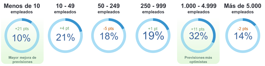 Las diferencias por tamaño de empresa son notables, aunque las previsiones de contratación se mantienen positivas en todos los segmentos. Las organizaciones de entre 1.000 y 4.999 empleados lideran el ranking, con expectativas del 32% y una mejora de 11 puntos respecto al trimestre anterior, consolidándose como las más optimistas para el inicio de 2026.
